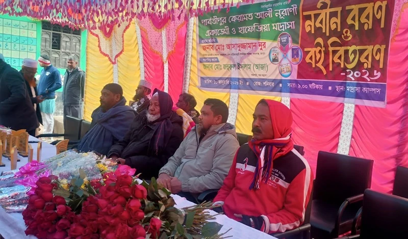 পার্বতীপুর কেরামত আলী নূরাণী একাডেমী ও হাফেজিয়া মাদ্রাসার নবীন বরণ ও বই বিতরণ/২০২৬ অনুষ্ঠিত হয়েছে। আজ শনিবার (১০ জানুয়ারি) সকালে মাদ্রাসা প্রাঙ্গনে আয়োজিত নবীন বরণ ও বই বিতরণ অনুষ্ঠানে প্রধান অতিথি হিসেবে উপস্থিত ছিলেন বিশিষ্ট ব্যবসায়ী ও সাবেক চেয়ারম্যান ৪নং হাড়িয়ারকুঠি ইউনিয়ন পরিষদ আসাদুজ্জামান নুর।