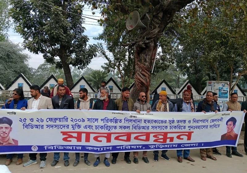কুড়িগ্রামে পিলখানা হত্যাকান্ডের সুষ্ঠতদন্ত ও জেলবন্দী বিডিআর সদস্যদের মুক্তি এবং চাকুরীচ্যুত সদস্যদের পুনঃবহালের দাবীতে মানববন্দন অনুষ্ঠিত হয়েছে। রোববার সকাল সারে ১০ টায় কুড়িগ্রাম ঘোষপারাস্ত শাপলা চত্বরে এ মানববন্ধন কর্মসুচি পালিত হয়েছে। মানববন্ধনে ২০০৯ সালের ২৫ ও ২৬ ফেব্রয়ারী পিলখানায় পরিকল্পিত হত্যাকান্ডকে বিদ্রোহ আক্ষায়িত করে প্রহসনের বিচারের নামে ১৮৫১৯ জন সদস্য কে বিভিন্ন মেয়াদে সাজার মাধ্যমে চাকুরীচ্যুত করে। ৮শতের অধিক কারাগারে মুত্যুর প্রহর গুনছে, কারাগারে আটক জেলবন্দীদের মুক্তির দাবিতে ক্ষতিগ্রস্ত বিডিআর ও তাদের পরিবার বর্গকে নিয়ে এক শান্তিপুর্ন মানববন্ধনের আয়োজন করা হয়েছে।