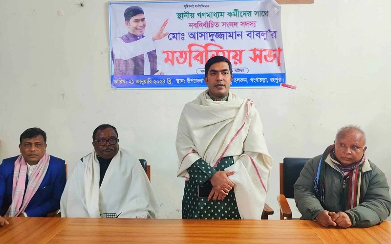 রংপুর-১ আসনের নবনির্বাচিত এমপি আসাদুজ্জামান বাবলু গঙ্গাচড়ায় স্থানীয় গণমাধ্যম কর্মীদের সাথে মতবিনিময় করেছেন। রোববার সন্ধ্যায় গঙ্গাচড়া উপজেলা স্বাস্থ্য কমপ্লেক্সের সভা কক্ষে তিনি মতবিনিময় করেন। মতবিনিময়কালে আসাদুজ্জামান বাবলু এমপি রংপুর ১ আসনের উন্নয়নে স্থানীয় গণমাধ্যম কর্মীদের সহযোগিতা কামনা করে বলেন, আমার ওপর অর্পিত দায়িত্ব সঠিকভাবে পালন করে এই আসনের মানুষের আশা আকাঙ্ক্ষার প্রতিফলন ঘটাতে পারি সেজন্য আপনাদের সহযোগিতা চাই। বিশেষ করে বেকার যুবকদের কর্মসংস্থান ও তিস্তা ভাঙন রোধে কাজ ও সংসদীয় এলাকাকে মাদকমুক্ত করতে পারি। এখানকার কোথায় কি সমস্যা আছে তা আমাকে অবগতসহ পত্রিকার মাধ্যমে তুলে ধরলে সমস্যাগুলো মহান জাতীয় সংসদে উপস্থাপন করে সমস্যা সমাধানের চেষ্টা করব। আমি এলাকার সন্তান হিসেবে এলাকার উন্নয়ন করতে সকলের দোয়া ও সহযোগিতা কামনা করছি। তিনি আরো বলেন, প্রধানমন্ত্রী জননেত্রী শেখ হাসিনা স্মার্ট বাংলাদেশ করার লক্ষ্যে কাজ করছেন। দেশে উন্নয়নের রোল মডেল হচ্ছে। কিন্তু সে-তুলনায় এ আসন অনেক পিছিয়ে আছে। প্রধানমন্ত্রীর উন্নয়নের ধারা এ এলাকায় সমান তালে নিতে সবার সহযোগিতা কামনা করছি । এছাড়া তাকে বিপুল ভোটে বিজয়ী করায় তিনি সকল জনগণের প্রতি কৃজ্ঞতা প্রকাশ করেন। মতবিনিময় কালে বক্তব্য রাখেন গঙ্গাচড়া প্রেসক্লাবের সহ-সভাপতি কমলাকান্ত রায়, যুগ্নসম্পাদক আব্দুল বারী স্বপন, তথ্য, সাংস্কৃতি ও ক্রীড়া সম্পাদক এসএম স্বপন, রিপোর্টাস ক্লাবের সভাপতি আব্দুল আলিম প্রামানিক, রিপোর্টার্স ইউনিটির সভাপতি জাকিরুল ইসলাম মন্টু, যুগ্নসম্পাদক নির্মল রায়, প্রেসক্লাব গঙ্গাচড়ার সাধারণ সম্পাদক বাবুল মিয়া, সাংগঠনিক সম্পাদক আব্দুল বারী দুলাল, বাংলাদেশ প্রেসক্লাব গঙ্গাচড়ার সভাপতি সুজন আহমেদ, প্রেসক্লাব, গঙ্গাচড়ার সভাপতি আব্দুল মজিদ, সাধারণ সম্পাদক আব্দুল মতিন অভি প্রমুখ।