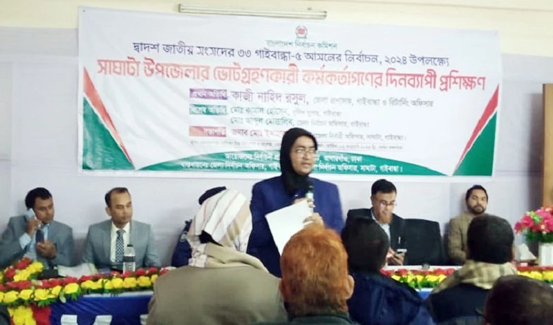দ্বাদশ জাতীয় সংসদ নির্বাচন উপলক্ষে গাইবান্ধার সাঘাটায় ২ জানুয়ারী ভোট গ্রহণকারী কর্মকর্তাগনের দিনব্যাপী প্রশিক্ষণ প্রদান করা হয়েছে। বোনারপাড়া বালিকা উচ্চ বিদ্যালয় এন্ড কলেজে প্রশিক্ষণের উদ্বোধন করেন, গাইবান্ধা জেলা প্রশাসক কাজী নাহিদ রসুল। সাঘাটা উপজেলা নির্বাহী কর্মকর্তা ও সহকারী রির্টানিং কর্মকর্তা মোঃ ইসাহাক আলী সভাপতিত্বে উদ্বোধনী সভায় বিশেষ অতিথির বক্তব্য রাখেন, জেলা পুলিশ সুপার কামাল হোসেন, অতিরিক্ত জেলা ম্যাজিষ্ট্রেট মোঃ মশিউর রহমান, জেলা নির্বাচন অফিসার আব্দুল মোত্তালিব।