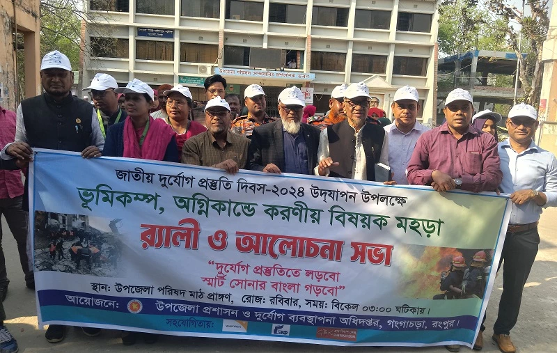 "দুর্যোগ প্রস্তুতিতে লড়বো, স্মার্ট সোনার বাংলা গড়বো" এ প্রতিপাদ্যে রংপুরের গঙ্গাচড়ায় জাতীয় দুর্যোগ প্রস্তুতি দিবস উদযাপন করা হয়েছে। উপজেলা প্রশাসন ও দুর্যোগ ব্যবস্থাপনা অধিদপ্তর গঙ্গাচড়ার আয়োজনে রোববার বিকেলে দিবসটি উদযাপন উপলক্ষে উপজেলা পরিষদ মাঠে ভূমিকম্প ও অগ্নিকান্ডে করণীয় বিষয়ক মহড়ার প্রদর্শন করা হয়। এছাড়া দিবসের তাৎপর্য তুলে ধরে র্যালি ও আলোচনা সভা অনুষ্ঠিত হয়। এতে অতিথি হিসেবে উপস্থিত ছিলেন উপজেলা চেয়ারম্যান আলহাজ্ব রুহুল আমিন, ভাইস চেয়ারম্যান সাজু আহম্মেদ লাল, গঙ্গাচড়া ইউপি চেয়ারম্যান মাজহারুল ইসলাম লেবু, এমপি প্রতিনিধি আব্দুল মতিন অভি,উপজেলা সমাজসেবা অফিসার মোসাদ্দেকুর রহমান, গঙ্গাচড়া সরকারি মডেল উচ্চ বিদ্যালয়ের প্রধান শিক্ষক মোঃ আব্দুল আখের মিঞা। উপজেলা প্রকল্প বাস্তবায়ন কর্মকর্তা সজীবুল করিম অনুষ্ঠানে স্বাগত বক্তব্য রাখেন। ভূমিকম্প ও অগ্নিকান্ডে করণীয় বিষয়ক মহড়ার প্রদর্শন করেন ফায়ার সার্ভিস ও সিভিল ডিফেন্সের সদস্যরা। এসময় সরকারি কর্মকর্তা, জনপ্রতিনিধি, সুধীজন, শিক্ষার্থী ও এনজিও'র প্রতিনিধিগণ উপস্থিত ছিলেন।