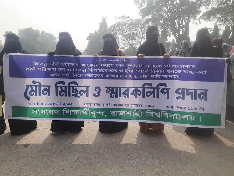 রাজশাহী বিশ্ববিদ্যালয়ে (রাবি) আসন্ন ভর্তি পরীক্ষার আবেদন ফরমে ‘কান দৃশ্যমান’ শর্ত বাতিল, পরীক্ষার হলে নিকাব খুলতে বাধ্য করা বন্ধ, প্রতিটি ভবনে মেয়েদের নামাজের স্থান নিশ্চিত করাসহ পাঁচ দফা দাবিতে মৌন মিছিল করেছেন শিক্ষার্থীরা।