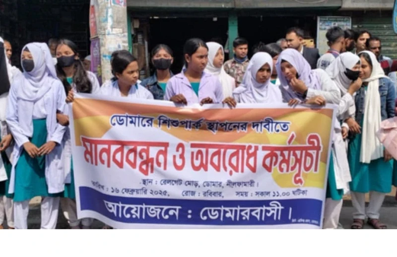 শিশুদের বিনোদন, শারীরিক ও মানসিক বিকাশের লক্ষ্যে নীলফামারীর ডোমারে শিশুপার্ক স্থাপনের দাবিতে অবরোধ এবং মানববন্ধন কর্মসূচি পালিত হয়েছে।