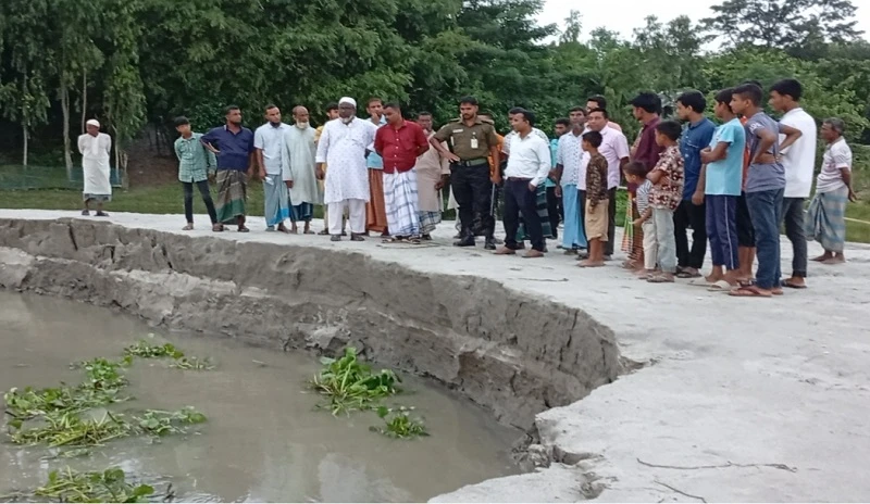 কুড়িগ্রামের চিলমারীতে ব্রহ্মপুত্র নদের ডানতীর রক্ষা প্রকল্পের পাশে, হুমকিতে রয়েছে বেরিবাঁধ। বেরিবাঁধের পাশে পিচিংয়ের নিচে, বড় ধরনের ভাঙনের দেখা দিয়েছে। ভাঙনের আতঙ্কে রয়েছে নদীর পাড়ের এলাকাবাসীরা। উপজেলার রাণীগঞ্জ ইউনিয়নের, ফকিরেরহাট কালিকুড়া (টি বাঁধ) এলাকায় টি বাঁধের দক্ষিণে ডানতীর রক্ষা প্রকল্পের পাশে, পিচিংয়ের পাশে ২ দিনের ব্যবধানে প্রায় ১শ মিটার এলাকা ভেঙে গেছে। ভাঙনকে ঘিরে ঐ এলাকার মানুষের মাঝে চরম আতঙ্কের দেখা দিয়েছে। জানাগেছে, ব্রহ্মপুত্র নদের কড়াল গ্রাস থেকে চিলমারীকে রক্ষার জন্য ডানতীর রক্ষা প্রকল্পের মাধ্যমে, নদের ডানতীর ও পানি উন্নয়ন বোর্ডের বন্যা নিয়ন্ত্রন বাঁধ রাস্তাটি ব্লক পিচিং করা হয়েছে। প্রকল্পের আওতায় উপজেলার রাণীগঞ্জ ইউনিয়নের ফকিরেরহাট এলাকা থেকে রমনা ইউনিয়নের জোড়গাছহাট বাজার পর্যন্ত কাজ সম্পন্ন করা হয়েছে। পরবর্তীতে কয়েক দফা পিচিংয়ে ধস দেখা দিলে, কুড়িগ্রাম পানি উন্নয়ন বোর্ডের তত্বাবধানে তা মেরামত করা হয়েছে বলে জানা যায়। সম্প্রতি উপজেলার রাণীগঞ্জ ইউনিয়নের কালিকুড়া (টি বাঁধ) এলাকার দক্ষিণ পাশে, ব্লক পিছিংয়ের নিচে প্রায় ১শ মিটার জায়গা নদীতে ভেঙে গেছে। ভাঙনের ২শ ফুট দক্ষিণে প্রায় ৫০মিটার জায়গা ভাঙনের দেখা দিয়েছিল। এই ভাঙনের দেখা দেয়ায় চরম ভাবে আতঙ্কে হয়ে পড়েছেন, নদী ভাঙ্গনের শিকার হওয়া নদীর তীরবর্তী এলাকার মানুষজন। সরেজমিনে গিয়ে দেখাযায়, ফকিরেরহাট কালিকুড়া টি বাঁধের দক্ষিণ পাশে, সেখানে প্রায় ১শ মিটার জায়গা নদীতে ভেঙে গেছে। তার ঠিক দক্ষিণে ২শ ফুট পরে প্রায় ৫০ মিটার নদীতে ভেঙে গেছে। এসময় ওই এলাকার আঃ মজিদ, সাইদুল ইসলাম, মন্জু মিয়া ও আসলাম মিয়াসহ অনেকে জানান, ৪/৫ দিন আগে এখানে তেমন কোন ভাঙা দেখা যায়নি, হঠাৎ আগামীকাল থেকে এই ভাঙন দেখা দিয়েছে। আমরা এলাকার মেম্বার ও চেয়ারম্যান কে ভাঙনের বিষয়ে জানিয়েছি। এখনই এটি সংস্কারের উদ্যোগ না নিলে, যে ভাবে ভাঙন শুরু হয়েছে। আগামী কয়েক দিনের মধ্যে নদের ডানতীরসহ বেরিবাঁধ ভেঙে যাওয়ার সম্ভাবনা রয়েছে বলে জানান এলাকাবাসীরা। জরুরী ভিত্তিতে প্রয়োজনীয় ব্যবস্থা গ্রহনের জন্য কর্তৃপক্ষকে অনুরোধ করেন তারা।