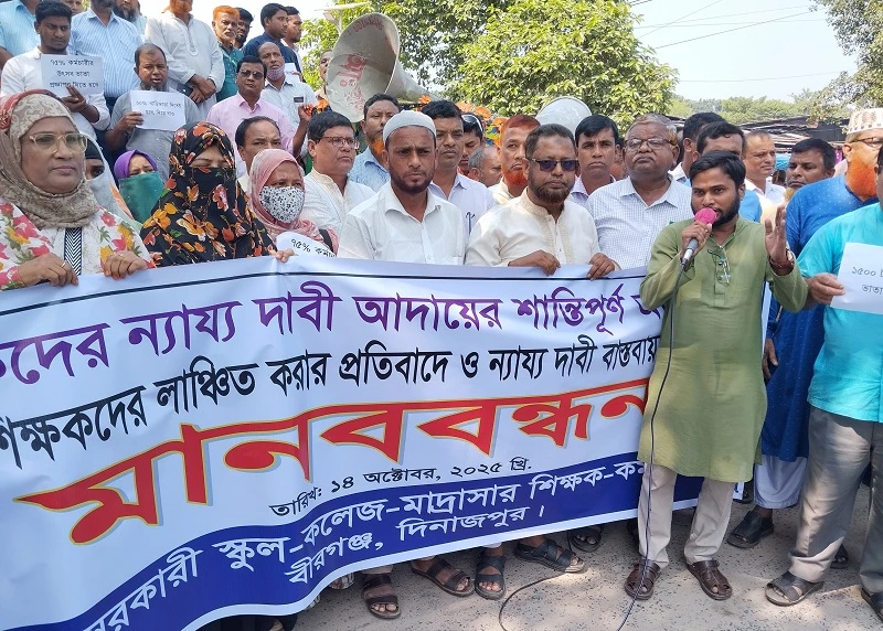 এমপিও ভূক্ত শিক্ষক ও কর্মচারীদের ন্যায্য দাবী আদায়ের আন্দোলনে ঢাকায় শিক্ষকদের লাঞ্চিত করার প্রতিবাদে দিনাজপুরের বীরগঞ্জে শিক্ষক ও কর্মচারীবৃন্দের মানববন্ধন অনুষ্ঠিত হয়েছে।