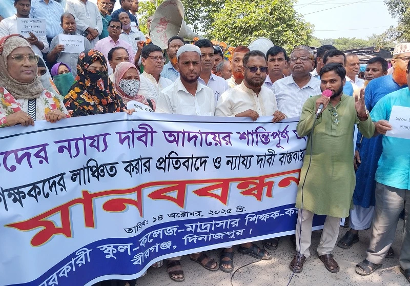 এমপিও ভূক্ত শিক্ষক ও কর্মচারীদের ন্যায্য দাবী আদায়ের আন্দোলনে ঢাকায় শিক্ষকদের লাঞ্চিত করার প্রতিবাদে দিনাজপুরের বীরগঞ্জে শিক্ষক ও কর্মচারীবৃন্দের মানববন্ধন অনুষ্ঠিত হয়েছে।