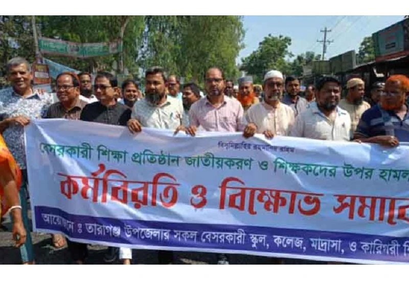 সারাদেশের শিক্ষকদের ওপর পুলিশের হামলার প্রতিবাদে কর্মবিরতি রেখে রংপুরের তারাগঞ্জে বিক্ষোভ ও সমাবেশ করেছে উপজেলার বিভিন্ন বে সরকারি প্রতিষ্ঠানের শিক্ষক-কর্মচারীরা। মঙ্গলবার (১৪ অক্টোবর) কর্মবিরতি দিয়ে দুপুর ১১ টার দিকে উপজেলার বেসরকারী এমপিওভুক্ত শিক্ষক-কর্মচারীর আয়োজনে বিক্ষোভ ও সমাবেশ করা হয়। বিক্ষোভটি নতুন চৌপথী থেকে শুরু হয়ে উপজেলার জনগুরুপ্তপূর্ণ সড়ক প্রদক্ষিন করে উপজেলা নির্বাহী অফিস চত্বরে গিয়ে শেষ হয়। পরে উপজেলা চত্বরে এক সমাবেশ অনুষ্ঠিত হয়। সমাবেশে বক্তব্য রাখেন তারাগঞ্জ বালিক স্কুল ও কলেজের অধ্যক্ষ শফিকুল ইসলাম, তারাগঞ্জ কারিগরি বি এম কলেজর অধ্যক্ষ আব্দুল হামিদ, তারাগঞ্জ কামিল মাদ্রাসার অধ্যক্ষ আব্দুর ছালাম, ইকরচালি উচ্চ বিদ্যালয়ের প্রধান শিক্ষক মনোয়ার হোসেন সাবু, ডাঙ্গীহাট স্কুল ও কলেজের প্রভাষক বুলবুল আহাম্মেদ প্রমুখ। সমাবেশ শেষে উপজেলা নির্বাহী অফিসার রুবেল রানাকে স্মারকলিপি প্রদান করেন।