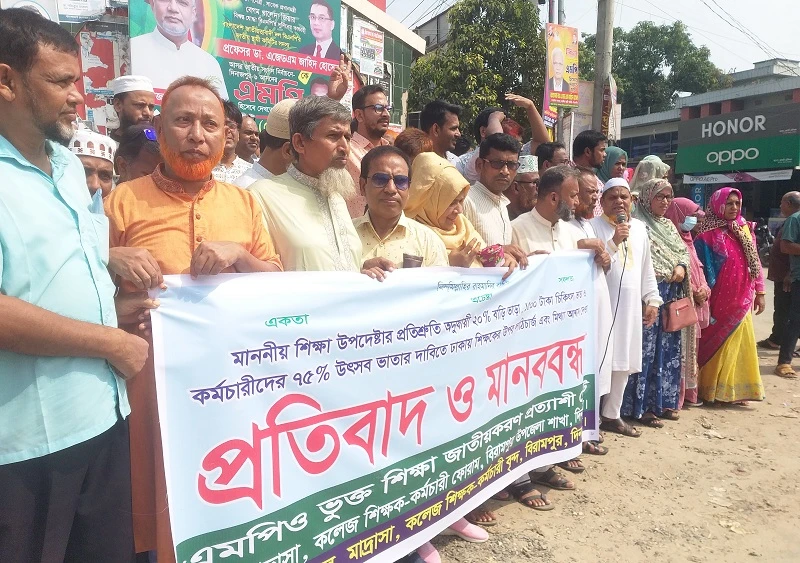 বিরামপুর উপজেলার বে-সরকারী শিক্ষকবৃন্দ বাড়ি ভাড়া, চিকিৎসা ভাতা ও উৎসব ভাতা বৃদ্ধির দাবি এবং ঢাকায় আন্দোলনরত শিক্ষকদের উপর লাঠিচার্জের প্রতিবাদে বুধবার (১৫ অক্টোবর) বিক্ষোভ মিছিল, মানববন্ধন ও প্রতিবাদ সভা করেছেন।