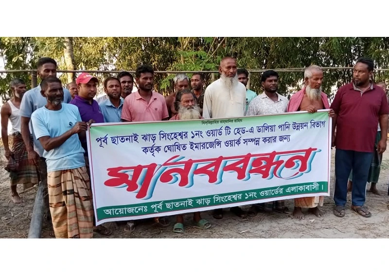 নীলফামারীর ডিমলায় পূর্ব ছাতনাই ইউনিয়নের ঝাড়সিংহেশ্বর ১নং ওয়ার্ড টি বাধ ডালিয়া পানি উন্নয়ন বিভাগ কর্তৃক ঘোষিত ইমারজেন্সি ওয়ার্ক সম্পন্ন করার জন্য মানববন্ধন করেছেন এলাকাবাসীগণ।