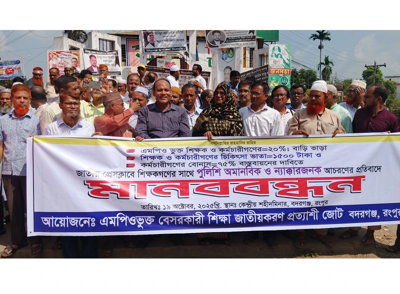 উপজেলা বেসরকারি শিক্ষক কর্মচারীগণ মানববন্ধন ও বিক্ষোভ সমাবেশ করেছেন। রবিবার (১৯ অক্টোবর) সকাল ১০ টায় এমপিওভুক্ত শিক্ষক কর্মচারীদের মূল বেতনের ২০ % বাড়ি ভাড়া, চিকিৎসা ভাতা ও কর্মচারীদের ৭৫% উৎসব ভাতা প্রদানের দাবিতে বদরগঞ্জ মডেল হাই উচ্চ বিদ্যালয় থেকে একটি মিছিল বের হয়ে শহরের প্রধান প্রধান সড়ক প্রদক্ষিণ শেষে কেন্দ্রীয় শহীদ মিনারে ২ ঘন্টাব্যাপী মানববন্ধন শেষ করে সমাবেশ অনুষ্ঠিত হয়।