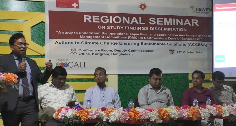 দিনব্যাপী সেমিনারে কুড়িগ্রাম জেলায় ঘন ঘন ও তীব্র দুর্যোগ বিশেষ করে বন্যা ও নদীভাঙনের—মুখোমুখি হয়ে জীবিকা হারাচ্ছে, ব্যাপক বাস্তুচ্যুতি ও গুরুতর সামাজিক-অর্থনৈতিক চ্যালেঞ্জের সম্মুখীন হচ্ছে। স্থানীয় পর্যায়ে ওয়ার্ড, ইউনিয়ন ও উপজেলা পর্যায়ে গঠিত দুর্যোগ ব্যবস্থাপনা কমিটিসমূহ দুর্যোগ প্রস্তুতি, প্রতিক্রিয়া ও পুনরুদ্ধারে গুরুত্বপূর্ণ ভূমিকা পালন করে। এ পরিপ্রেক্ষিতে ২০২৪ সালে হেলভেটাস বাংলাদেশ-এর সহায়তায় একটি গবেষণা পরিচালিত হয়। যার লক্ষ্য ছিল ডিএমসিগুলোর কার্যকারিতা মূল্যায়ন ও সক্ষমতা বৃদ্ধির কৌশল নির্ধারণ করা।