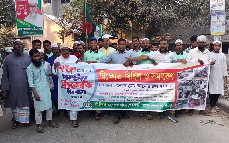 পল্টন ট্রাজেডি দিবস উপলক্ষে দিনাজপুরের হিলিতে বিক্ষোভ মিছিল ও সমাবেশ করেছে জামায়াতে ইসলামী হাকিমপুর উপজেলা শাখা। মঙ্গলবার বিকেল সাড়ে ৩ টায় উপজেলার চারমাথা মোড়ে আলোচনা সভা শেষে একটি মিছিল বন্দরের প্রধান প্রধান সড়ক প্রদক্ষিন শেষে একই স্থানে এসে শেষ হয়।