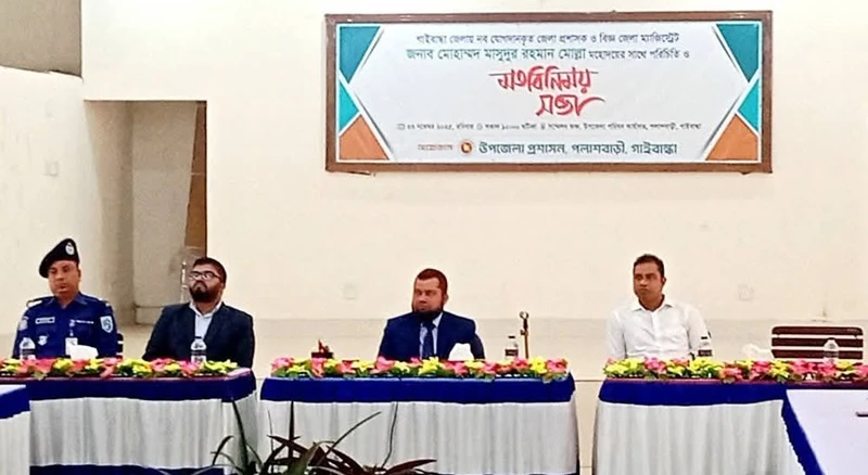 গাইবান্ধা জেলার পলাশবাড়ী উপজেলা পরিষদের বিভিন্ন দপ্তর প্রধানগণ, ইউপি চেয়ারম্যানগণ,পৌর প্রশাসন, শিক্ষকমন্ডলী, প্রিন্ট ও ইলেক্ট্রনিক মিডিয়ার সাংবাদিকবৃন্দসহ বিভিন্ন শ্রেনী পেশার মানুষের সাথে গাইবান্ধার নবাগত জেলা প্রশাসক ও জেলা ম্যাজিস্টেট মোহাম্মাদ মাসুদুর রহমান মোল্লার সাথে এক মতবিনিময় সভা অনুষ্ঠিত হয়েছে।