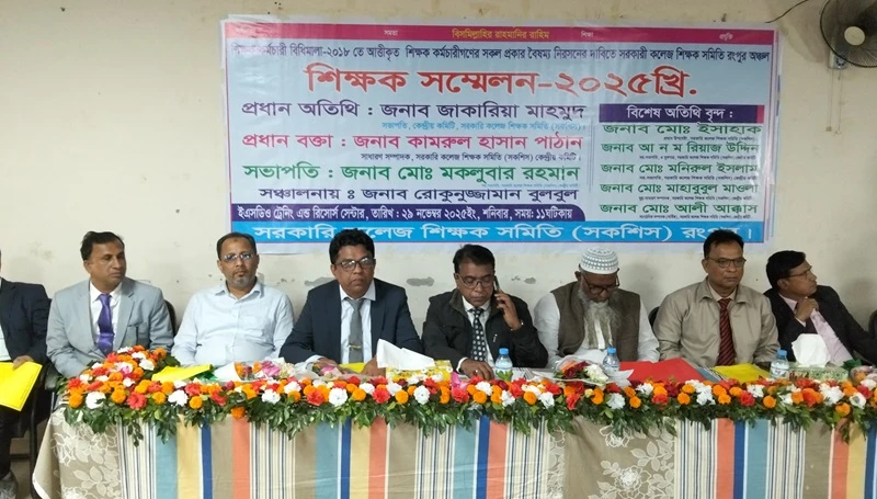 শিক্ষক কর্মচারী বিধিমালা-২০১৮ তে আত্তীকৃত শিক্ষক কর্মচারীগণের সকল প্রকার বৈষম্য নিরসনের দাবিতে সরকারী কলেজ শিক্ষক সমিতি রংপুর অঞ্চলের শিক্ষক সম্মেলন-২০২৫ অনুষ্ঠিত হয়েছে। শনিবার (২৯ নভেম্বর) বেলা সাড়ে ১২ টায় সরকারি কলেজ শিক্ষক সমিতি (সকশিস) রংপুরের আয়োজনে ইএসডিও ট্রেনিং এন্ড রিসোর্স সেন্টার হলরুমে আয়োজিত শিক্ষক সম্মেলনে প্রধান অতিথি হিসেবে উপস্থিত ছিলেন সকশিস কেন্দ্রীয় কমিটির সভাপতি জাকারিয়া মাহমুদ ও প্রধান বক্তা ছিলেন সাধারণ সম্পাদক কামরুল হাসান পাঠান । সকশিস কেন্দ্রীয় কমিটির সহ-সভাপতি মকলুবার রহমানের সভাপতিত্বে ও রোকনুজ্জামানের সঞ্চালনায় বিশেষ অতিথি হিসেবে উপস্থিত ছিলেন কেন্দ্রীয় প্রধান উপদেষ্টা ইসাহাক, সহ-সভাপতি ও মূখপাত্র আনম রিয়াজ উদ্দিন, সহ-সভাপতি মনিরুল ইসলাম, যুগ্ন সাধারণ সম্পাদক মাহাবুবুল মাওলা, সাংগঠনিক সম্পাদক (সার্বিক) আলী আক্কাস।