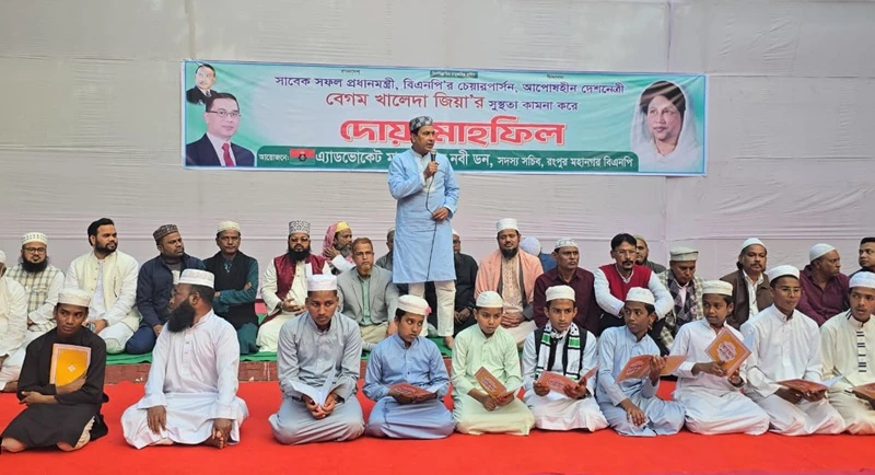 সাবেক প্রধানমন্ত্রী ও বিএনপি’র চেয়ারপার্সন বেগম খালেদা জিয়ার সুস্থতা কামনায় দোয়া মাহফিল অনুষ্ঠিত হয়েছে। শনিবার বিকেলে নগরীর পাবলিক লাইব্রেরীর মাঠে দোয়া মাহফিলে প্রধান অতিথি ছিলেন মহানগর বিএনপির সদস্য সচিব মাহফুজ উন নবী ডন, সিনিয়র যুগ্ন আহ্বায়ক শহিদুল ইসলাম মিজু, মহানগর যুবদলের আহ্বায়ক নুরুন্নবী চেীধুরী মিলন, সিনিয়র যুগ্ম আহ্বায়ক জহির আলম নয়ন সদস্য সচিব আতিকুল ইসলাম লেলিন, মহানগর কৃষক দলের সভাপতি শাহ নেওয়াজ লাবু, এনসিপি নেতা শেখ রেজওয়ান, আলমগীর কবিরসহ বিএনপি এবং সকল অঙ্গ ও সহযোগী সংগঠনের নেতা কর্মী ও রংপুরের সর্বস্তরের জনসাধারণ উপস্থিত ছিলেন।
