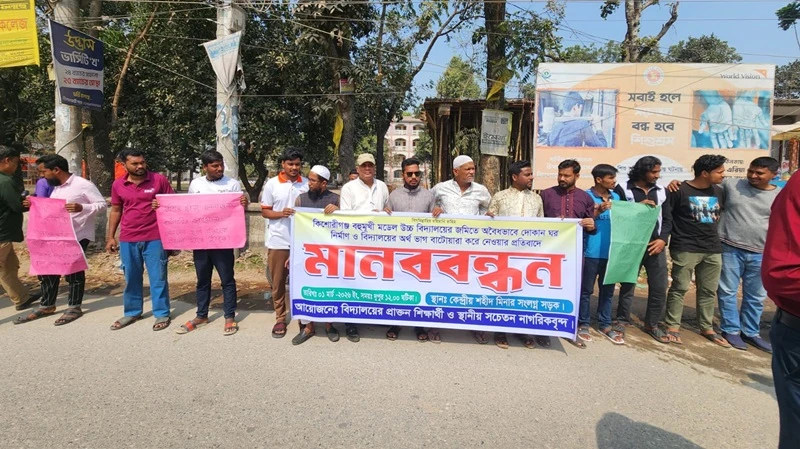 কিশোরগঞ্জে বিদ্যালয়ের সৌন্দর্য বিনষ্ট ও অর্থ আত্মসাতের প্রতিবাদে শিক্ষার্থীদের মানববন্ধন