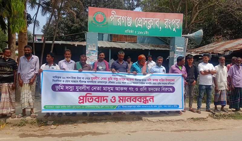 বুধবার দুপুরে পীরগঞ্জ প্রেসক্লাবের সামনে এ মানববন্ধন অনুষ্ঠিত হয়। এতে বক্তব্য রাখেন ভূক্তভোগী পরিবারের সদস্য তৌহিদুল ইসলাম মন্ডল, সাংবাদিক কবি-সাহিত্যিক স্বাপ্তাহিক বজ্রকথা’র সম্পাদক ও প্রকাশক সুলতান আহমেদ সোনা, প্রেসক্লাবের সাধারণ সম্পাদক হাবিবুর রহমান হাবিব, পৌর বিএনপি নেতা আব্দুল করিম সরকার, পৌর যুবদল নেতা একরামুল হক প্রমুখ।